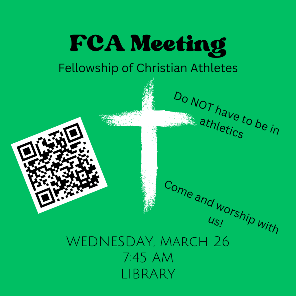 Come join FCA for a morning bible study on Wednesday at 8:00 am in the library. Please stop by and see Mrs. Graham, Mrs. Griffith, or Mrs. Gandy for a permission slip or fill it out online.